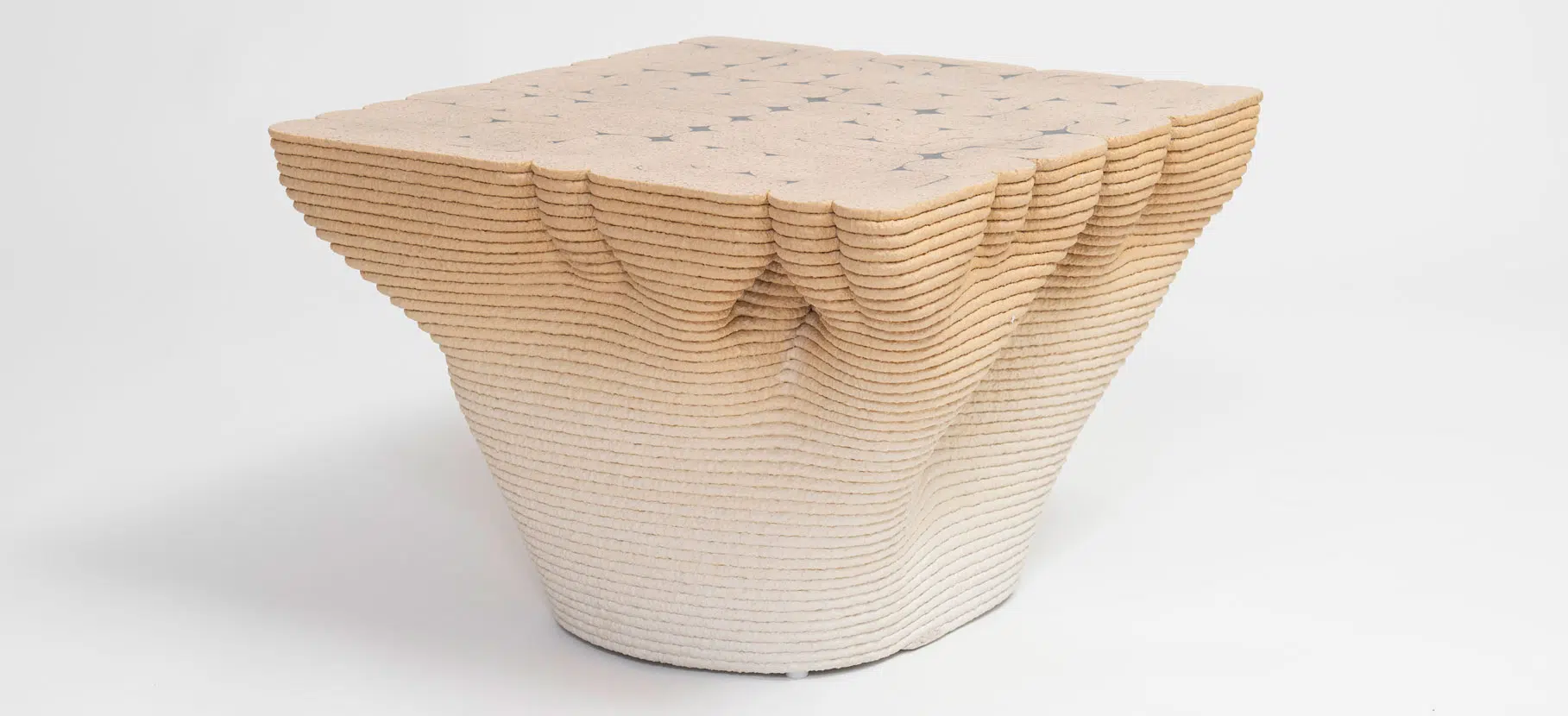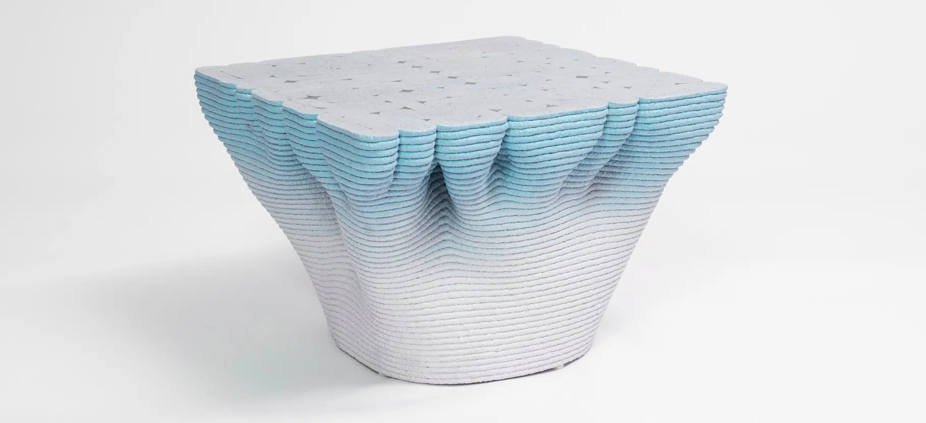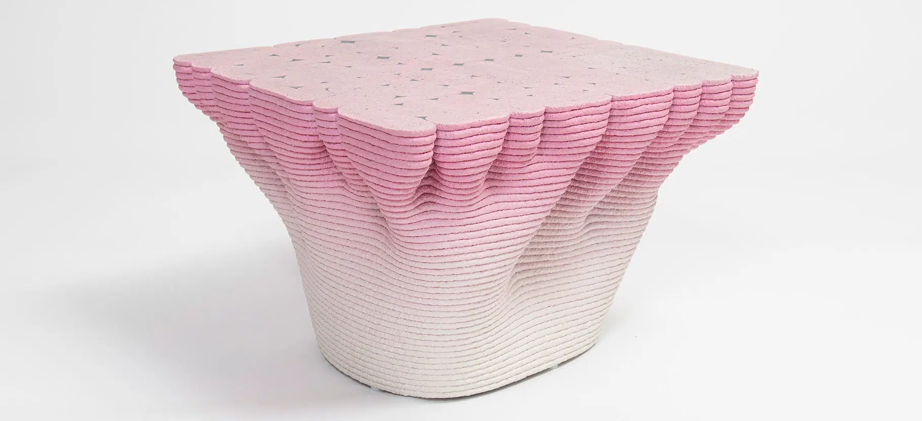 The sculptural base is generated through digital parametric modeling, resulting in a complex, organic geometry that would be nearly impossible to achieve with traditional casting methods. The organic geometry demonstrates the adaptability of concrete in contemporary design, while the sculptural curves underscore how digital design can unlock new aesthetic qualities in this material. Through precise color dosing during the printing process, delicate gradients emerge that further emphasize the fluidity of the form and enrich its sculptural presence.